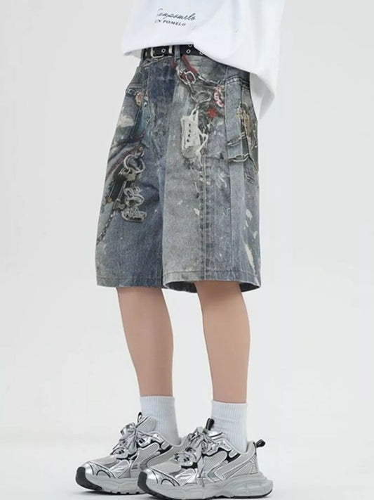 Men's Full Size Vintage Chain Print Denim Shorts Plus Size