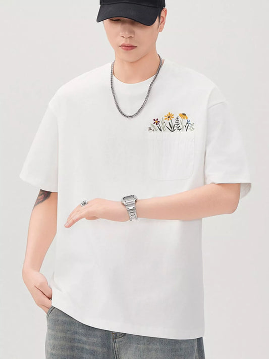 Men's Plus Size Floral Pocket Embroidered Casual T-Shirt