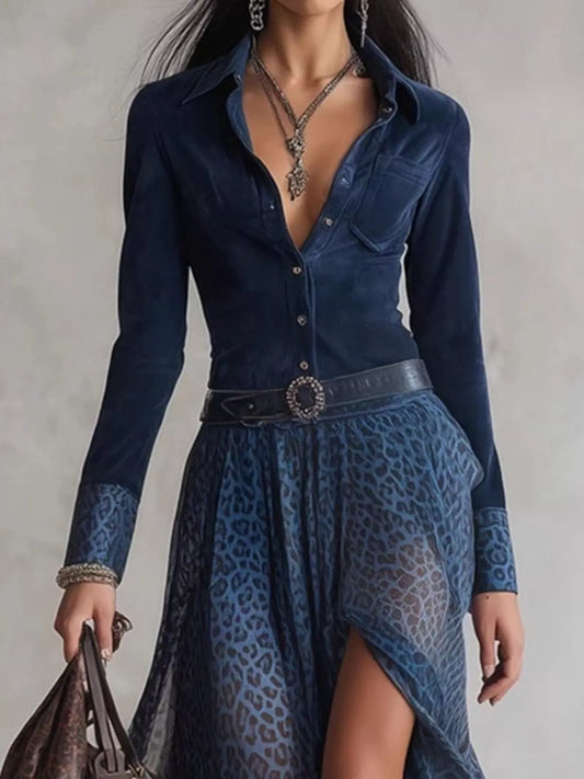 Slit Printed V-Neck Long Sleeve Midi Dress